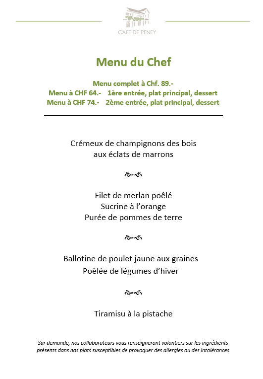 Le CAFE DE PENEY vous propose différents menus au choix, pour l’organisation de vos événements spéciaux, tels que banquets, repas de famille, anniversaires, repas d’entreprise, baptêmes, mariages, etc.